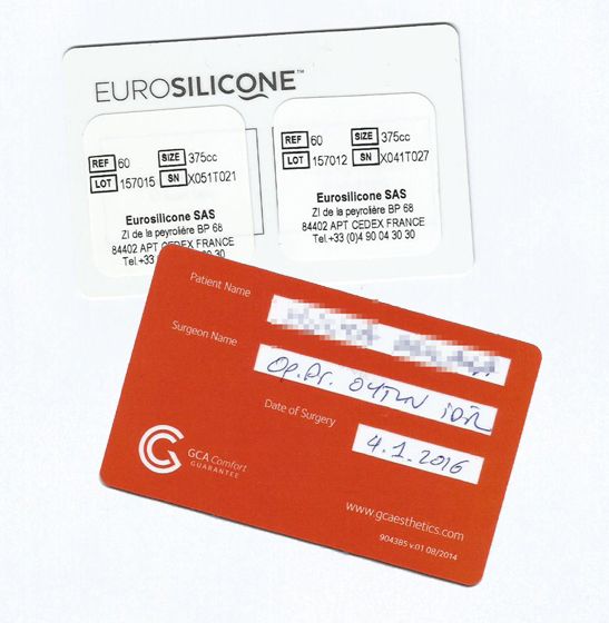 İmplantların kutusundan, implantların markasını, modelini, hacmini yazan bir kart ve çıkartmalar çıkar. Bu kart ameliyat sonunda hastaya verilir (bu kartı doktorunuzdan mutlaka isteyiniz; sebebini uyarılar kısmında bulacaksınız..). Çıkartmalardan birer tane hasta dosyasında ameliyat notunun altına yapıştırılır..