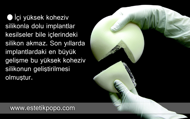 Koheziv silikon jel dolu olanlar ise, yüksek yoğunluklu, yumuşak şekerlemeler (jelibon) kıvamında, akışkan olmayan bir silikonla doludur. Dış kılıfları katı silikondur ve tamamen inert (vücutta herhangi bir reaksiyon vermeyen) bir maddedir. Bu implantlar kesilse, yırtılsa bile içlerindeki yüksek koheziv silikon akmaz. Bu implantların CE onayı vardır..